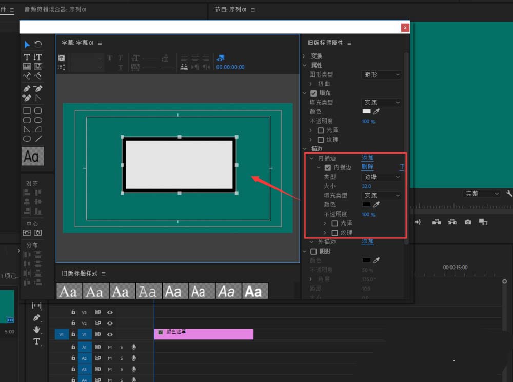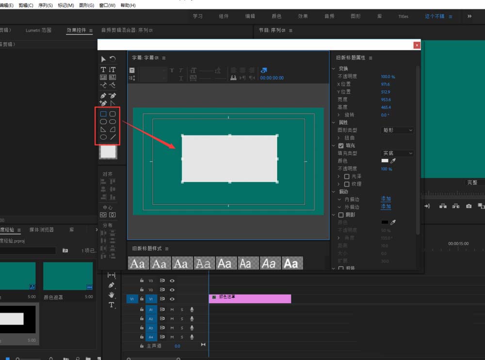 5、新建一个字幕,打开旧版标题窗口,在旧版标题窗口中使用基本图形工具绘制一个基本图形出来。这里绘制的是一个矩形。