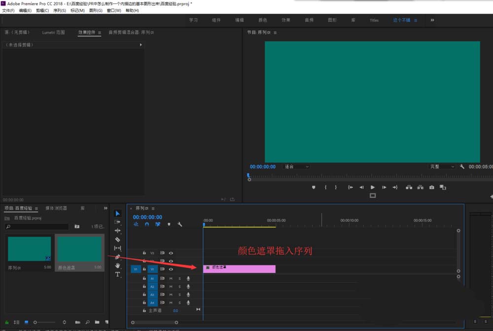 3、将创建的颜色遮罩素材拖到序列时间轴的视频轨道上,这样颜色遮罩就作为PR整个项目的背景颜色出现。