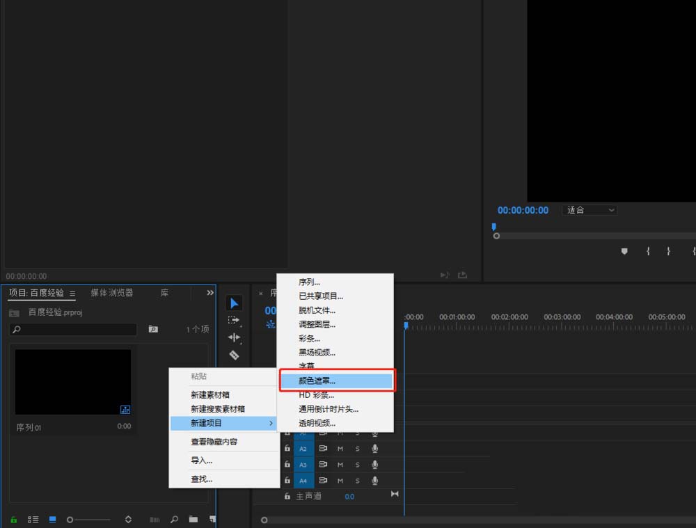 2、然后在项目窗口右键鼠标,会出现右键鼠标选项,在这个右键鼠标选项中选择新建“颜色遮罩”。根据提示一步步创建一个颜色遮罩出来。