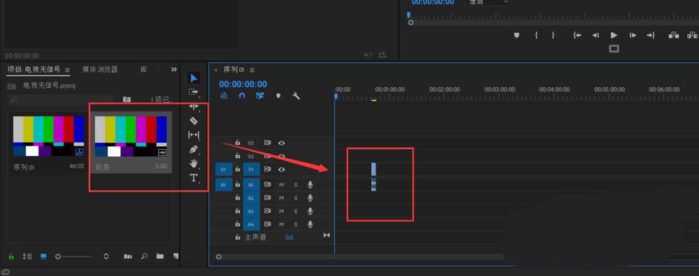 4、把创建的这个彩条拖入到序列的时间轴窗口的视频轨道上,我们看到所谓的彩条就是一个无信号的电视画面,并且自带了一个哔哔的音效背景。