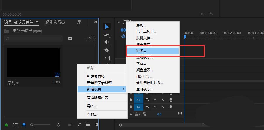 3、在PR软件的项目管理窗口,单击鼠标右键,在出现的右键命令中执行新建中的彩条,来创建一个彩条出来。