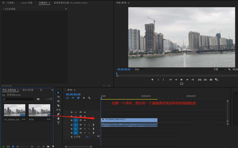 2、导入了文件之后,来创建一个剪辑序列,这里序列的设置大家根据自己的项目要求进行创建,然后将导入的视频文件拖到序列的视频轨道。