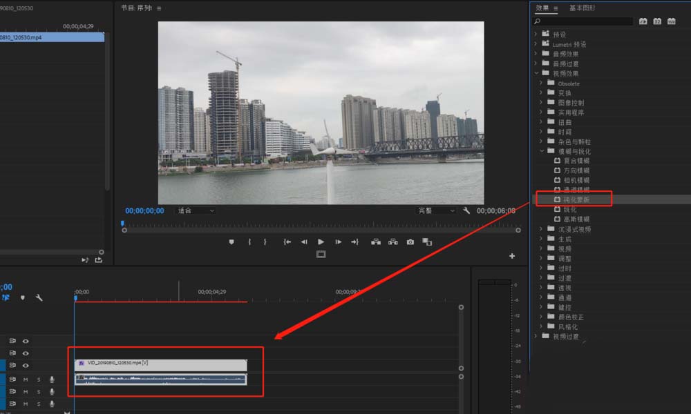 4、在出现的效果窗口中展开视频效果中的模糊与锐化,找到“钝化蒙版”这个视频效果,并将钝化蒙版的视频效果给视频文件添加。