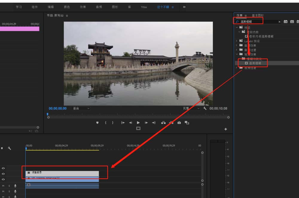 4、在效果窗口中进行搜索“高斯模糊”得到这个高斯模糊的视频效果,将这个高斯模糊视频效果拖到调整图层上。