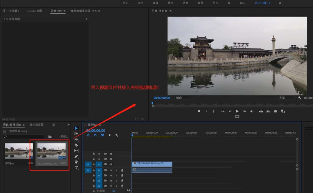 2、然后在选择视频文件媒体导入到PR项目中,将导入的视频文件拖到序列的时间轴对应的视频轨道上。