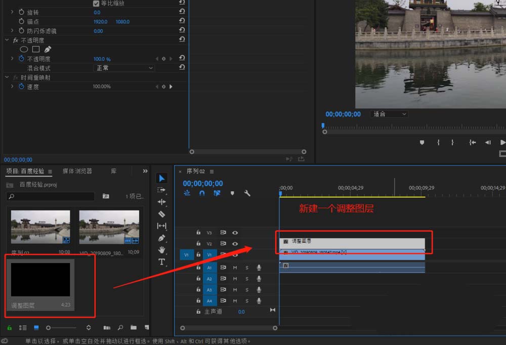 3、在来新建一个调整图层出来,并且将这个新建的调整图层移到序列的两一个视频轨道,位于视频文件的上方。