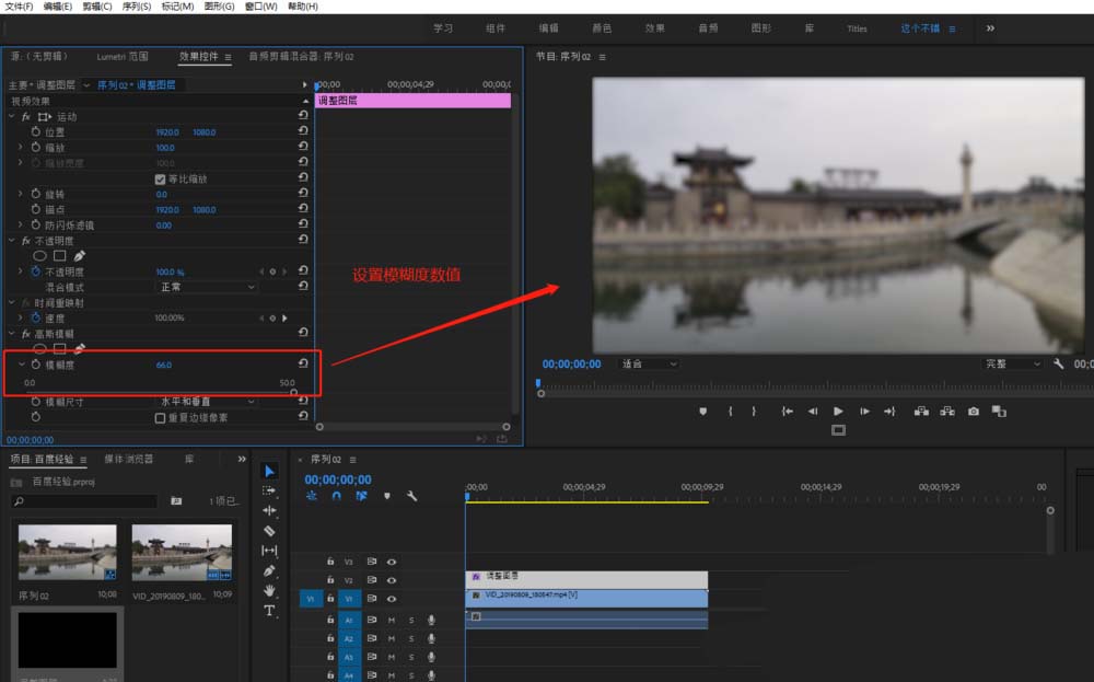 5、打开调整图层的效果控件,可以看到添加的高斯模糊的视频效果,设置高斯模糊的模糊度数值就可以看到视频画面的模糊效果。