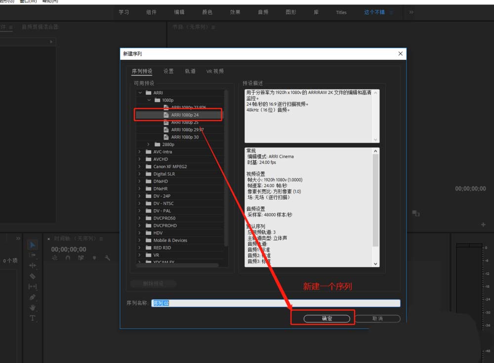 1、在一个空白PR项目中,点击新建按钮,来新建一个序列,这里我直接选择了一个默认序列,点击创建。