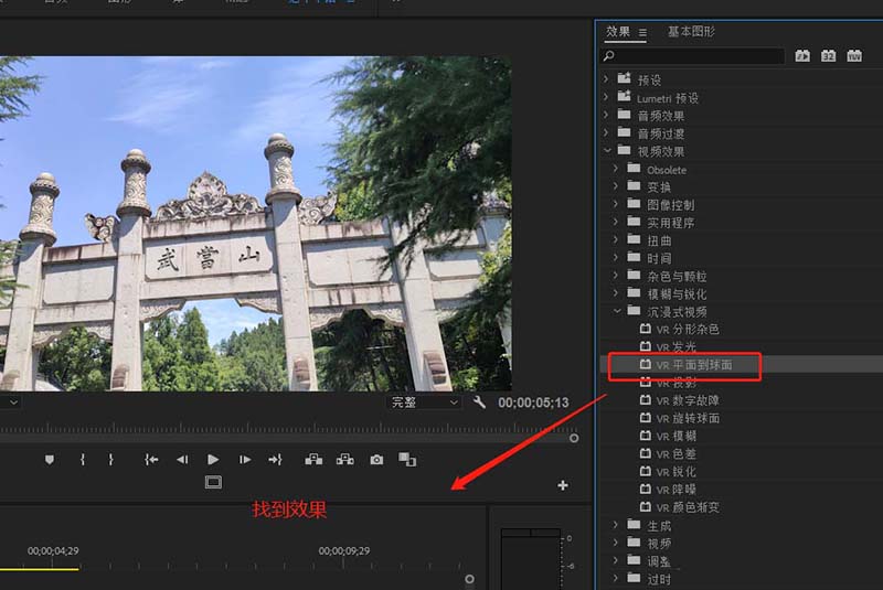 4、显示效果窗口,展开视频效果中的沉浸式视频类型效果,在其中找到“VR平面到球面”这个效果。