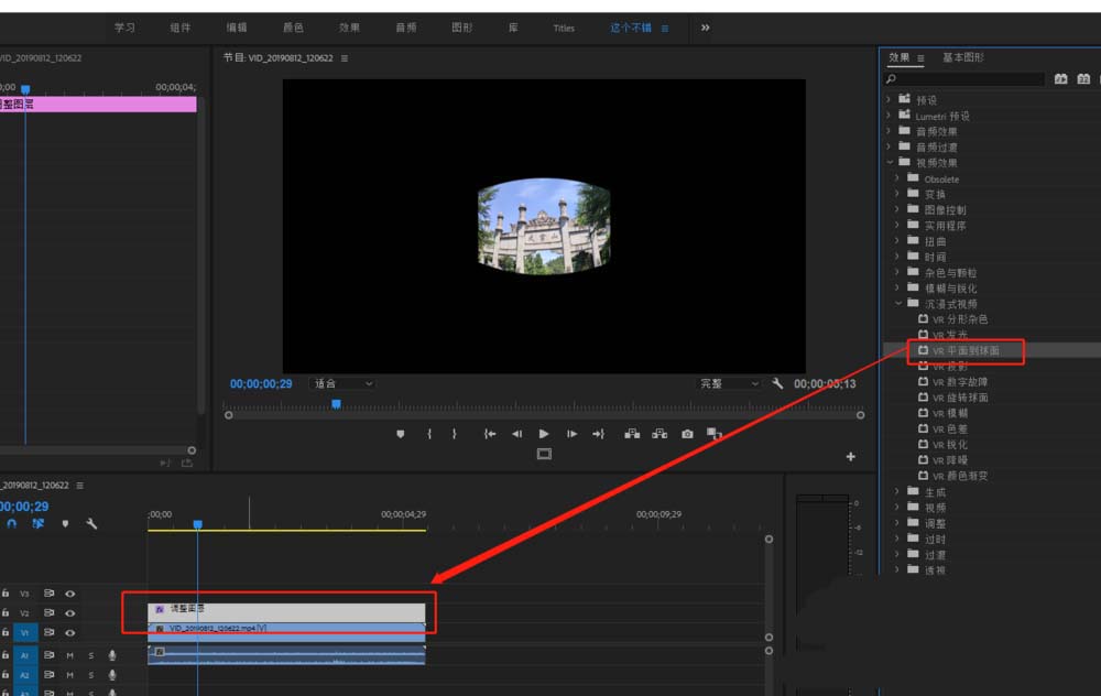 5、将找到的VR平面到球面视频效果选中并按住鼠标左键不松进行拖动,拖动到调整图层上在松开鼠标。这样就为调整图层添加了效果,我们也可以看到视频画面发生了变化。