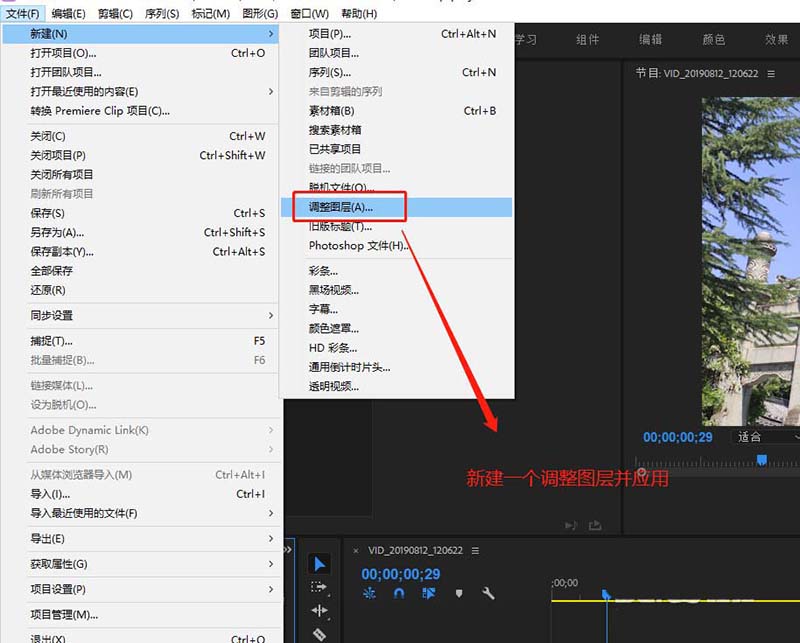 3、展开文件菜单栏,在文件菜单栏中执行新建,选择新建调整图层,将新建后的调整图层应用到视频轨道2.