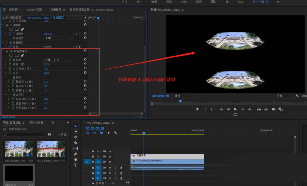 6、在效果控件中找到“VR平面到球面”效果的参数设置,通过修改效果参数可以得到不同的球面效果。