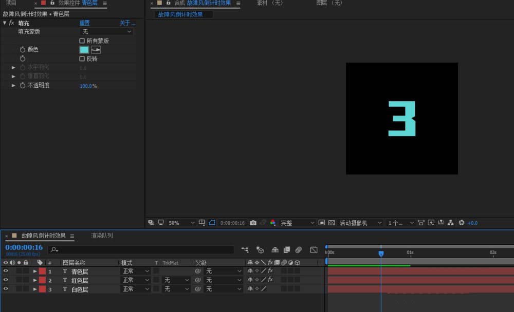 2、ctrl+t输入数字3 居中对齐,调整好大小;打开数字下面的文本-源文本(给源文本k关键帧间隔1s,k上3.2.1)并把文本图层命名为白色层