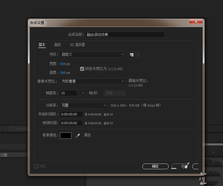 1、打开AE软件,命名融合滚动效果,调整相应的参数。