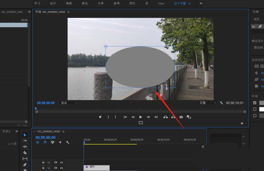 3、选择了椭圆之后,拖动鼠标左键在视频画面上画出一个椭圆图形出来,调整椭圆的大小与位置。