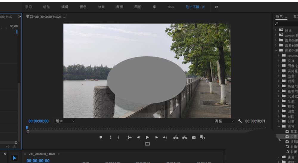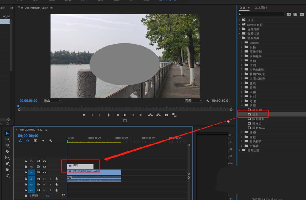 4、切换到效果窗口,找到视频效果中的投影效果,将这个投影效果拖动椭圆图形媒体对象上面。