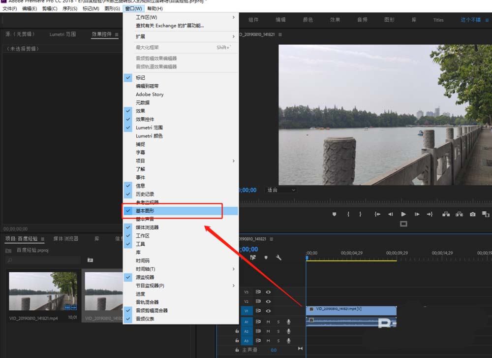 1、打开一个PR项目或者自行创建一个PR项目,然后在PR窗口菜单栏中勾选显示“基本图形”窗口面板。