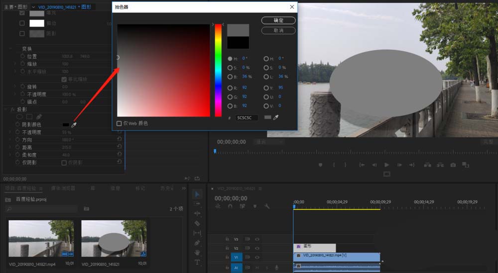 6、这里我们还可以单击更改投影的颜色,为投影设置不一样的颜色效果。这样我们就为当前的媒体对象添加了投影效果。