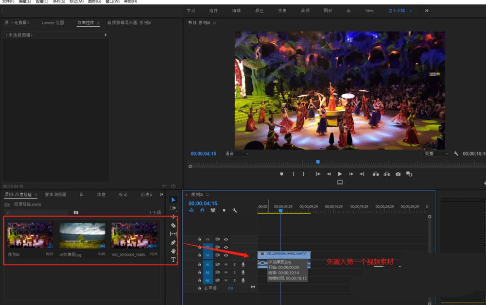 1、在PR项目中创建剪辑序列,然后导入两个素材,一个动态视频素材,一个静态图片素材,先将视频素材置于序列的时间轴轨道1.