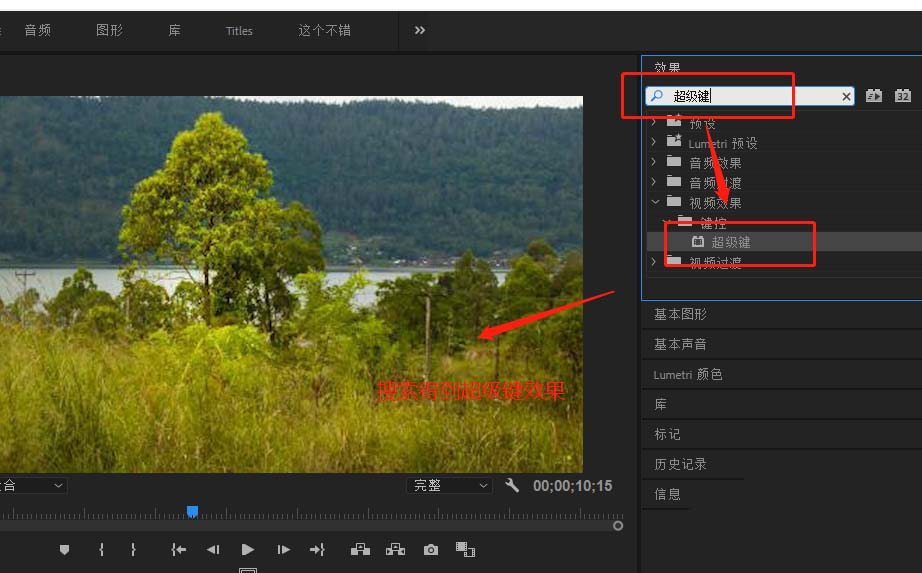 3、显示效果窗口,在效果窗口中搜索关键字“超级键”,进行搜索得到超级键的视频效果。