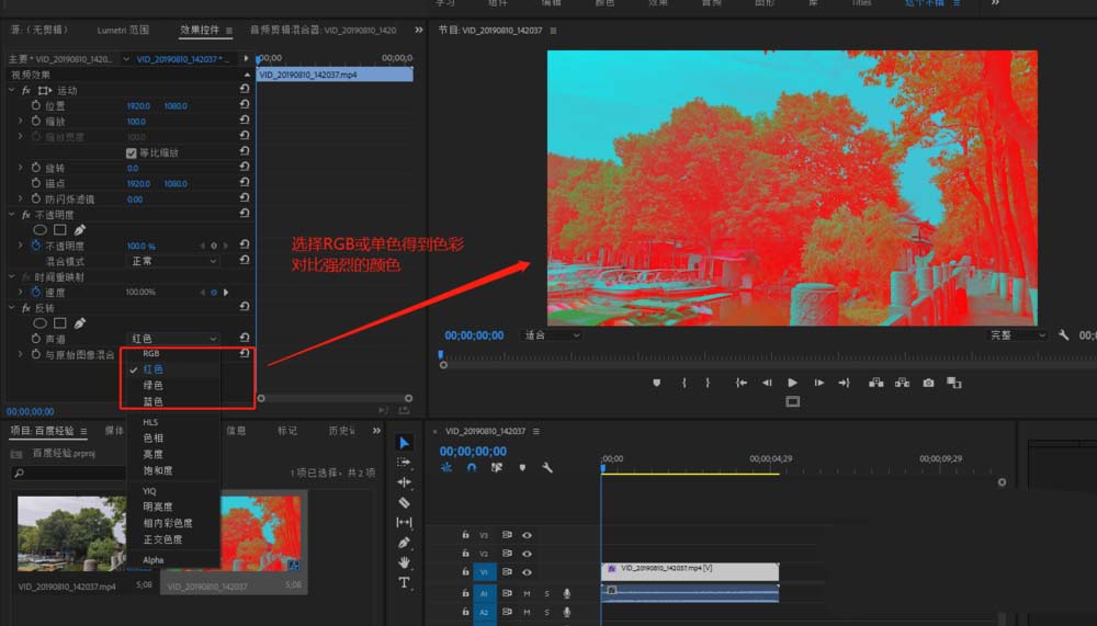 4、在效果控件的反转效果设置中,先可以尝试选择声道为RGB,或者是红色、绿色与蓝色,这样可以得到颜色反差对比强烈的视频画面颜色。