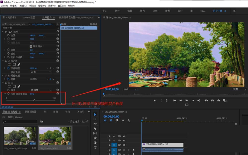 6、最后在反转效果的效果控件设置中还有一个“与原始图像混合”,设置混合程度,选择其效果与原图像进行混合。