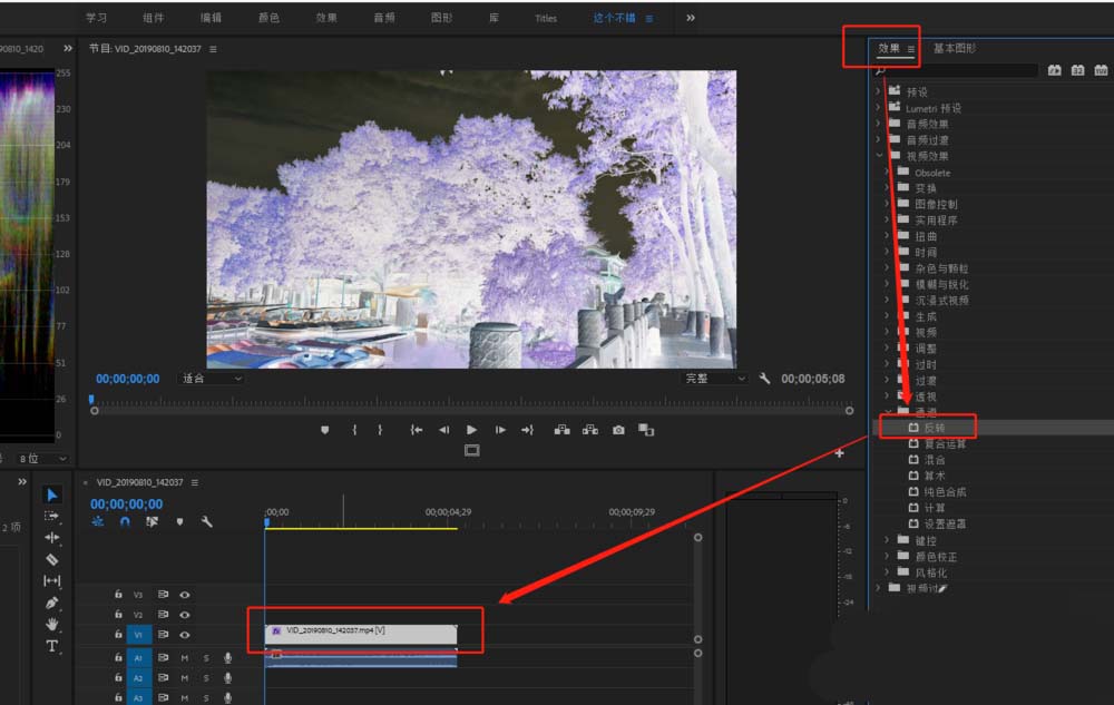 3、打开效果窗口,在效果窗口中进行查找找到“反转”效果,将反转效果应用于视频媒体对象。