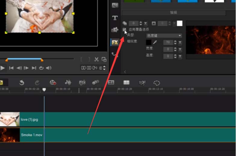 3、然后选中视频素材,打开选项界面,如下图所示,勾选应用覆叠选项