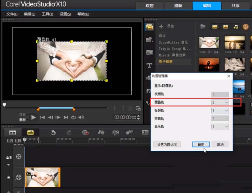 1、首先打开会声会影软件,然后拖入一张图片,并设置覆叠轨为2,如下图所示