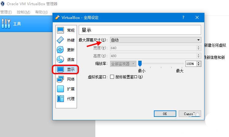 2、进入全局设置菜单,点击“显示”可以查看virtualbox的虚拟机分辨率显示设置。