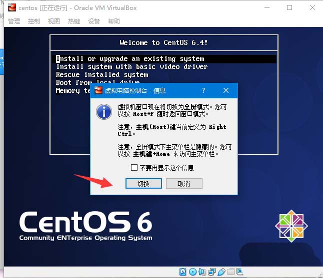 7、根据视图工具栏提示,使用快捷键或者鼠标点击可以进入虚拟机virtualbox全屏模式。