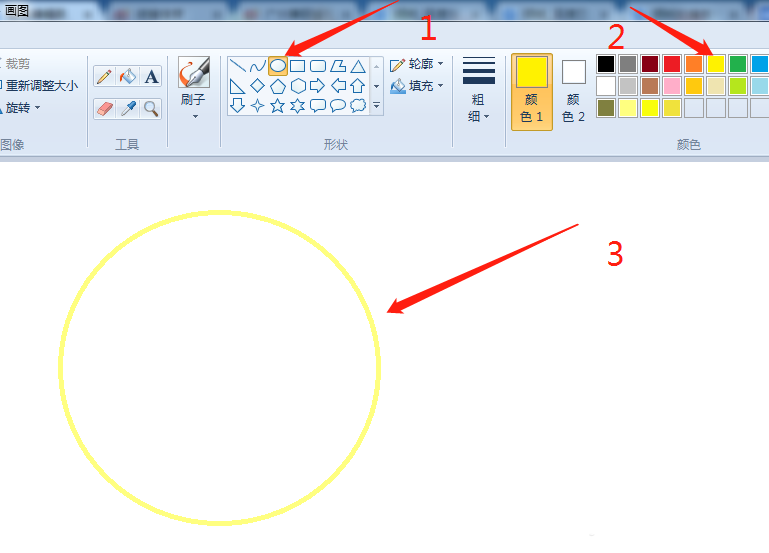 2、选择椭圆工具,然后颜色选择黄色,按住“Shift”键,拖动鼠标在画布上画出一个圆。