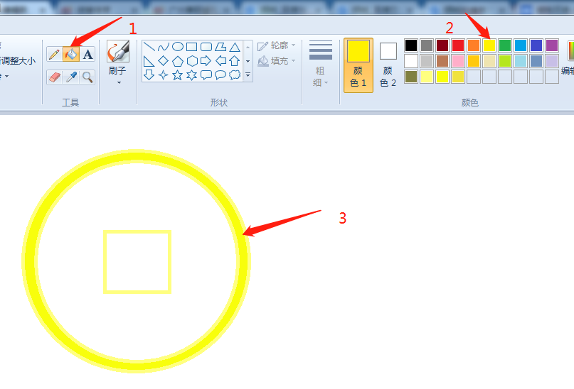 5、选择油漆桶工具,颜色选黄色,给外围的圆环填充颜色。