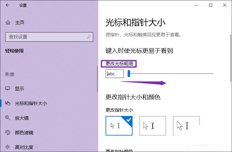 5、将更改光标粗细的滑动按钮向右滑动。