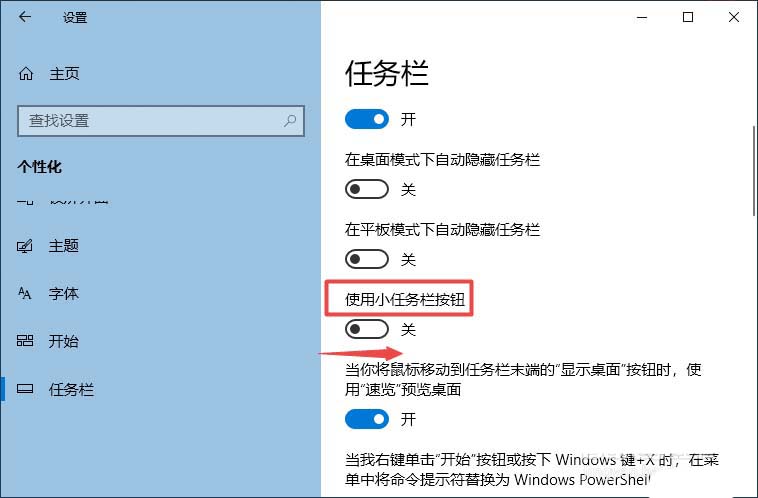 5、然后将使用小任务栏按钮的开关向右滑动。