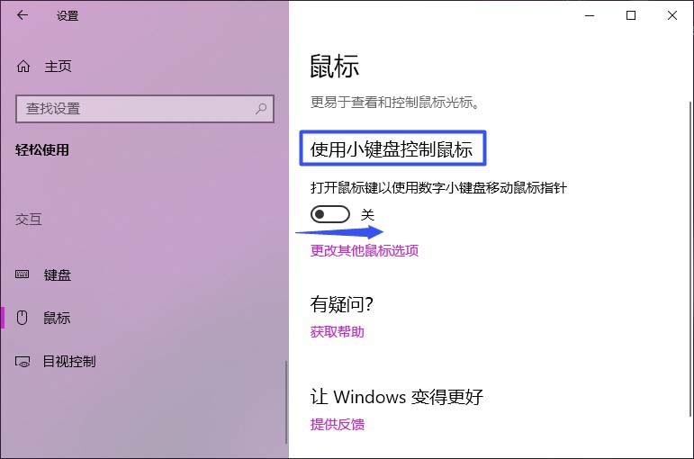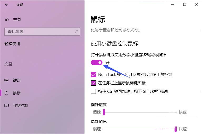 5、将使用小键盘控制鼠标的开关向右滑动打开即可。