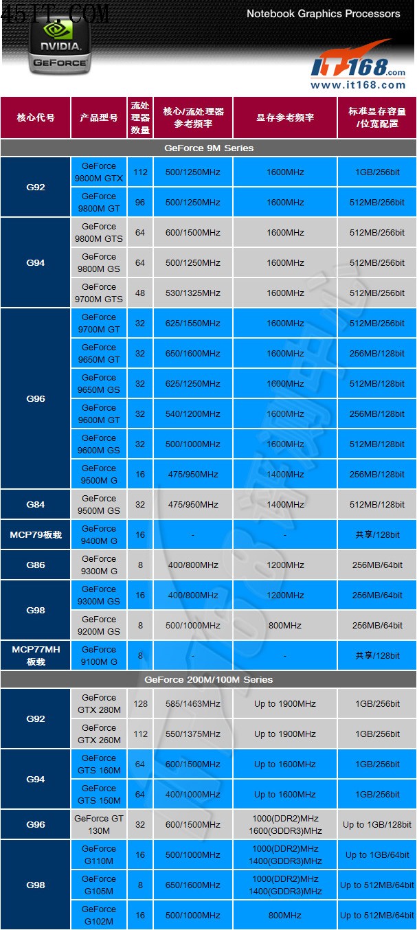 就以GeForce 9600M系列为例,该系列一共有4个型号的产品,型号命名与核心规格并没有清晰的命名规则。实际上,整个GeForce 9600M系列的产品都是基于G96的图形核心,也就是等于桌面平台的GeForce 9500GT而不是GeForce 9600,性能存在相当大的差距。而其他系列的型号也同样如此,一般的消费者甚至对DIY略懂的玩家都不能通过产品型号大概判断出产品的性能表现,从而影响到用户不能准确地选择自己实际需要的产品规格。