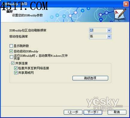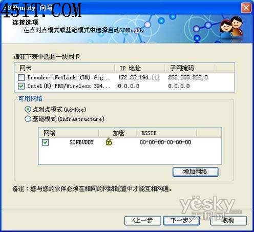 首先我们在需要对联的电脑上安装好该程序,并将一台电脑设置为主机。在该主机上运行SONbuddy程序,程序提供了设置向导方式,我们只需按照提示一步步操作即可。在设置过程中值得注意的是,在“可用网络”项中点选“点对点模式(Ad-Hoc”,并勾选下面 “SONbuddy”复选框(图3。