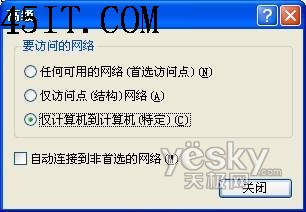 在该界面中,单击右下角的“高级”按钮打开“高级选项”界面,在“要访问的网络”选项中点选“仅计算机到计算机”(图2。这一点设置非常重要,通过这项设置我们便开启了无线网卡的点对点互联功能。