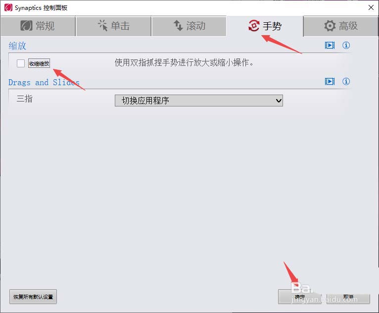 7、然后我们点击手势,之后我们点击取消掉收缩缩放,之后我们点击确定就可以了。