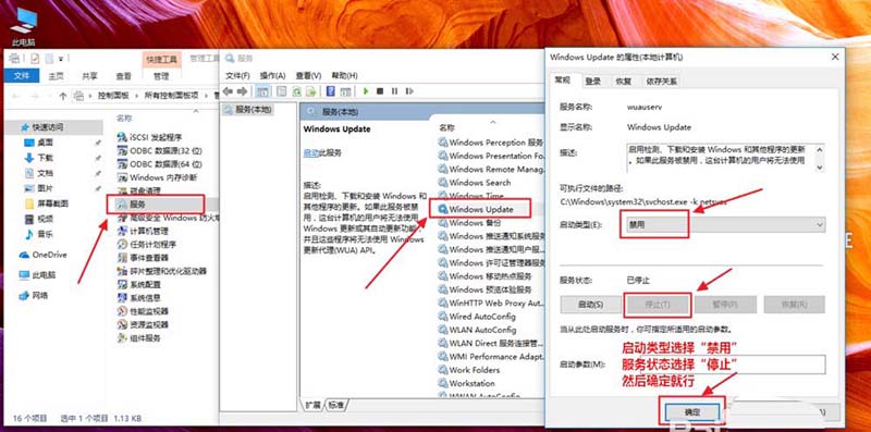 6、服务——windows update——禁用——停止——确定(操作这个步骤后应用商店无法使用,如要使用应用商店跳过此步骤)