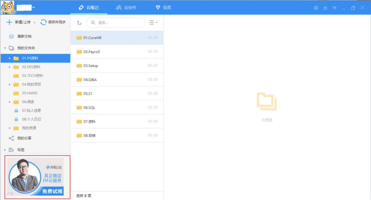 1. 首先我们可以看到有道云笔记界面左下角有一个影响美观的广告