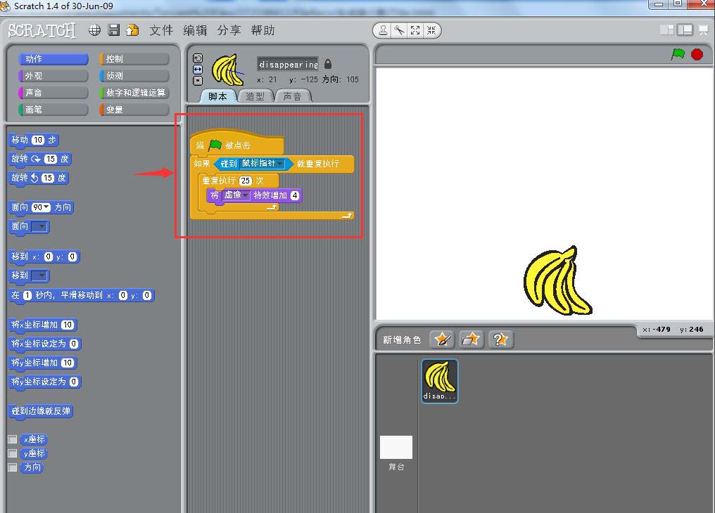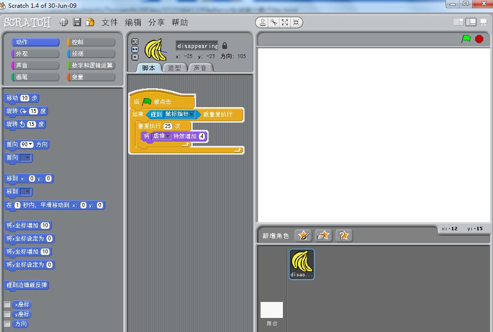 6、给香蕉添加如下脚本,我们设置当香蕉碰到鼠标指针,就让它的虚像特效增加4,重复执行25次,这样虚像特效增加到100时,香蕉就消失了;