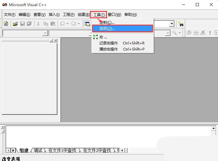 2、打开VC++6.0程序,点击菜单栏上的“工具(T)”,在出现的下拉列表中选择“选项(O)...”,如下图所示。