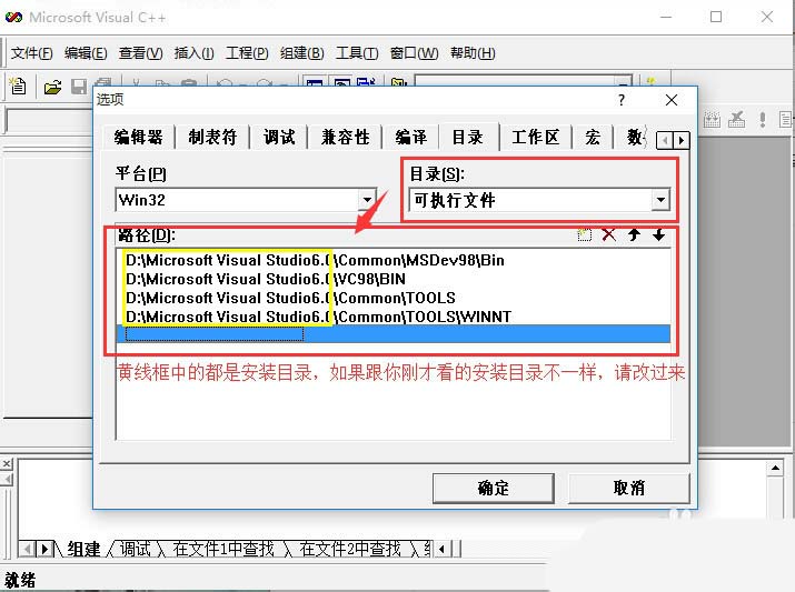 4、首先,我们在“目录(S)”对应的下拉框中选择“可执行文件(executatble files)”,在"路径(D)"(也就是红线框)中可以看到一共有四行路径,黄线框中的代表的是VC++6.0的安装路径,如果不是你的安装路径,请改为安装路径。