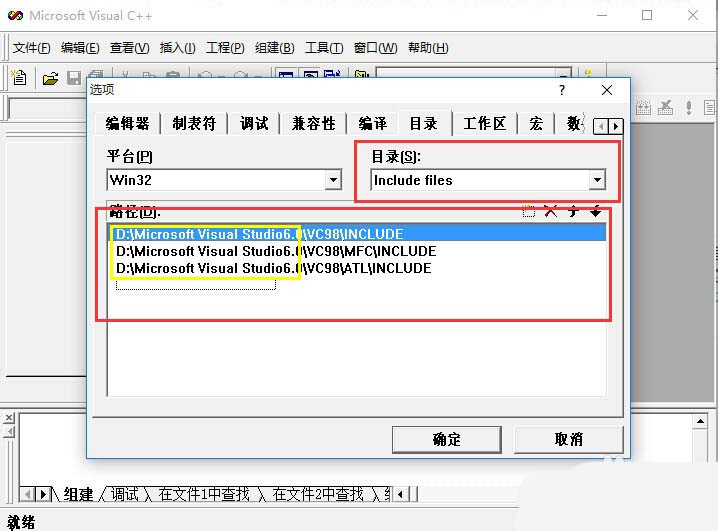 5、然后,再在“目录(S)”对应的下拉框中选择“include files”,在"路径(D)"(也就是红线框)中可以看到一共有三行路径,黄线框中依然代表VC++6.0的安装路径,如果不是请改为安装路径。