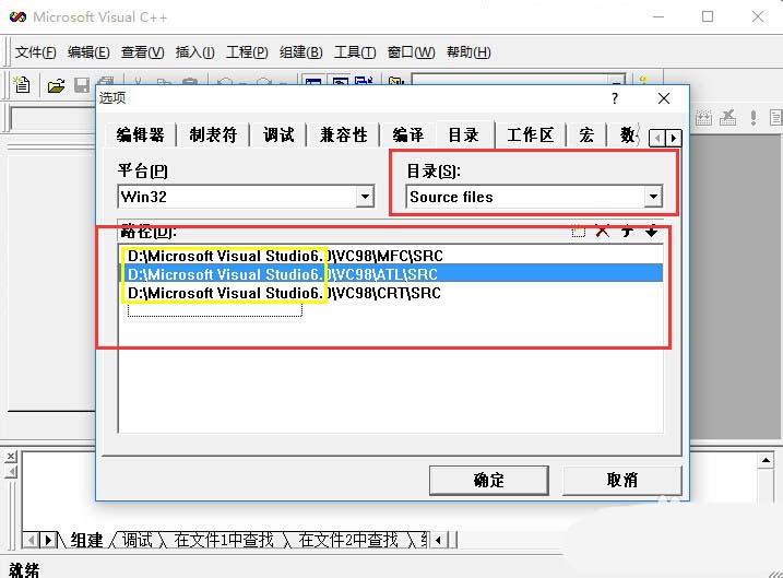 7、然后,再在“目录(S)”对应的下拉框中选择“source files”,在"路径(D)"(也就是红线框)中可以看到一共有三行路径(也许不止三行,但红线框中的四行很关键),黄线框中依然代表VC++6.0的安装路径,如果不是请改为安装路径。