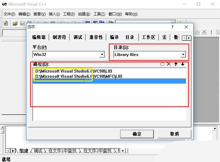 6、然后,再在“目录(S)”对应的下拉框中选择“library files”,在"路径(D)"(也就是红线框)中可以看到一共有两行路径,黄线框中依然代表VC++6.0的安装路径,如果不是请改为安装路径。