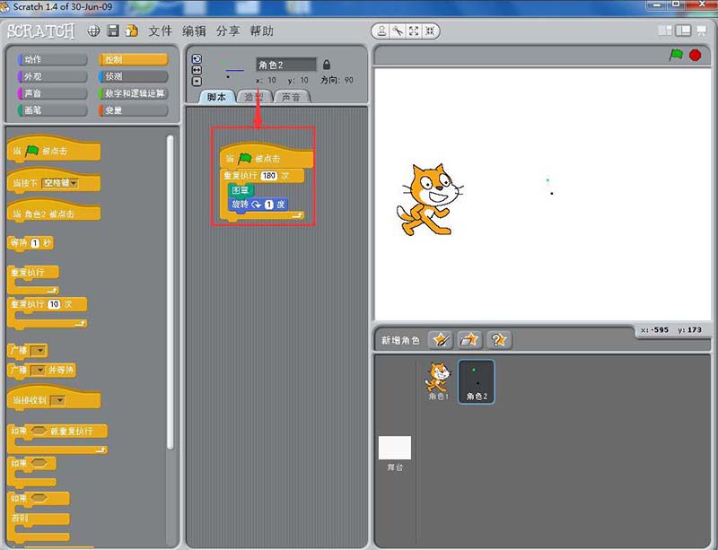 5、添加如下脚本,用到了点击绿旗、图章、旋转、重复执行命令;