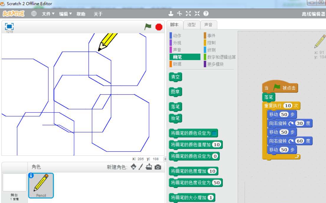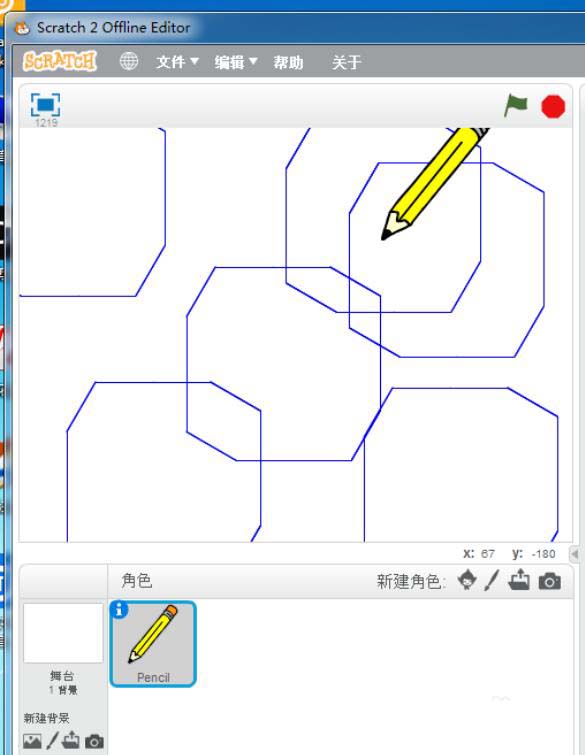 5、接下去,重复点击绿旗画图,产生抽象画效果。画笔移动一点角度,产生艺术画,